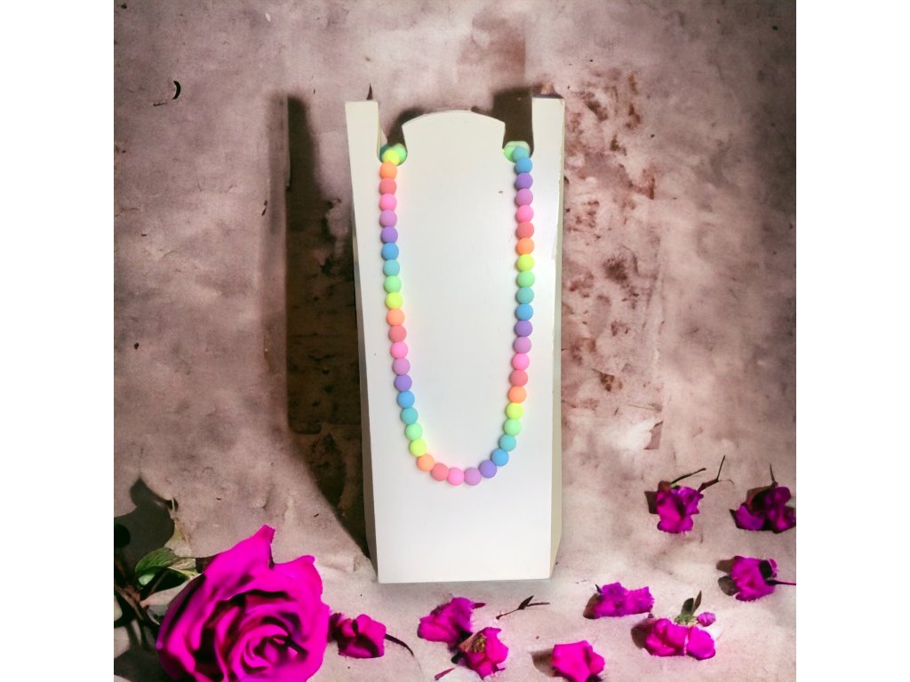 Pastelové multi náhrdelníky vyrobené ze skleněných korálků. Náhrdelníky svítí pod UV lampou.