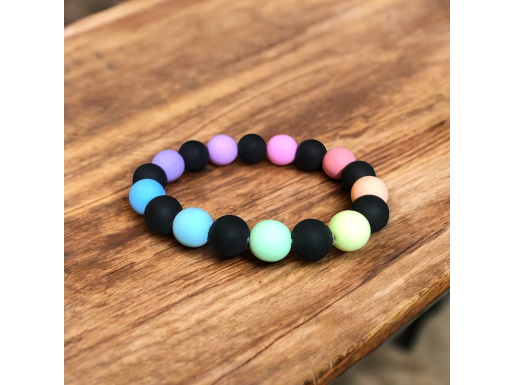 Pastelový náramek doplněný černou matnou korálkou jsou vyrobené ze skleněných korálků. Náramky svítí pod UV lampou.