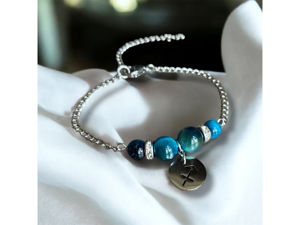 Elegantní náramek z kvalitní chirurgické ocele, doplněný přívěskem znamení Střelce a minerálem modré tygří oko. Tento kámen přináší klid, soustředění a duševní rovnováhu. Pomáhá utišit rozptýlenou mysl, posiluje vnitřní jistotu a odvahu jít vlastní cestou. Modré tygří oko je také kamenem pravdy a vhledu – podporuje jasnou komunikaci a chrání před negativní energií.