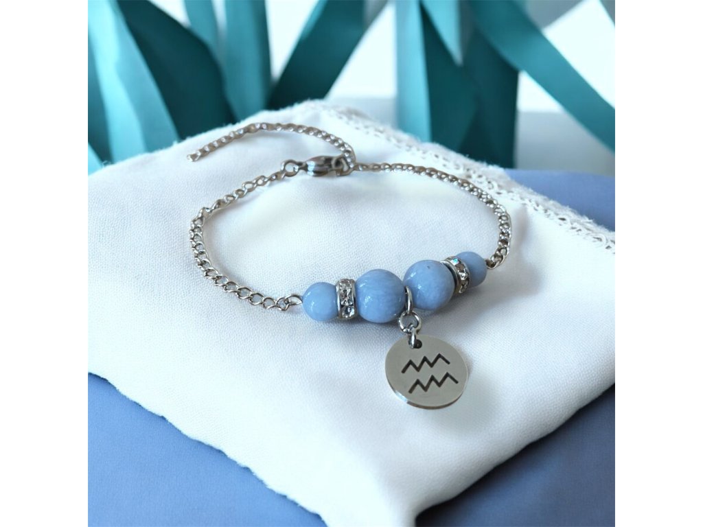 Elegantní náramek z kvalitní chirurgické ocele, doplněný přívěskem znamení Vodnáře a minerálem angelit. Angelit je kámen klidu, míru a jemné energie – podporuje vnitřní rovnováhu, harmonizuje emoce a přináší pocit bezpečí. Posiluje komunikaci, usnadňuje vyjadřování myšlenek a podporuje porozumění sobě i druhým. Angelit také rozvíjí intuici, podporuje meditaci a pomáhá zbavovat se stresu a negativních energií, čímž působí jako ochranný talisman.