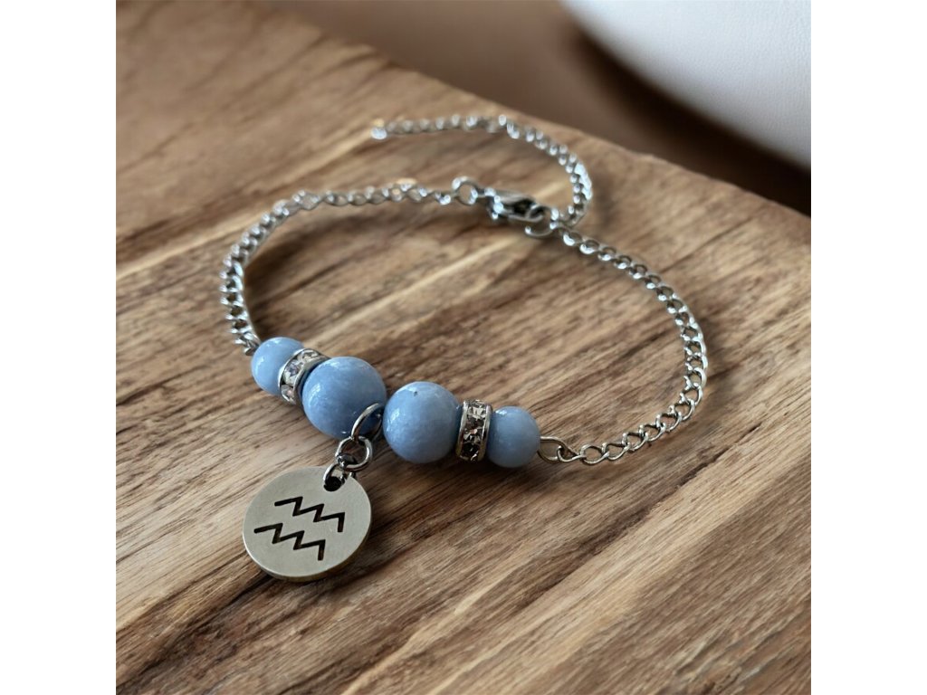 Elegantní náramek z kvalitní chirurgické ocele, doplněný přívěskem znamení Vodnáře a minerálem angelit. Angelit je kámen klidu, míru a jemné energie – podporuje vnitřní rovnováhu, harmonizuje emoce a přináší pocit bezpečí. Posiluje komunikaci, usnadňuje vyjadřování myšlenek a podporuje porozumění sobě i druhým. Angelit také rozvíjí intuici, podporuje meditaci a pomáhá zbavovat se stresu a negativních energií, čímž působí jako ochranný talisman.